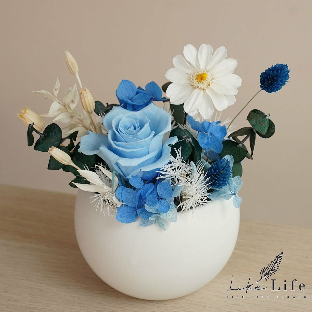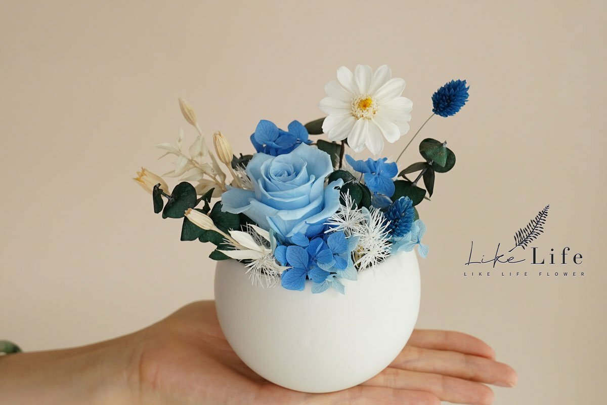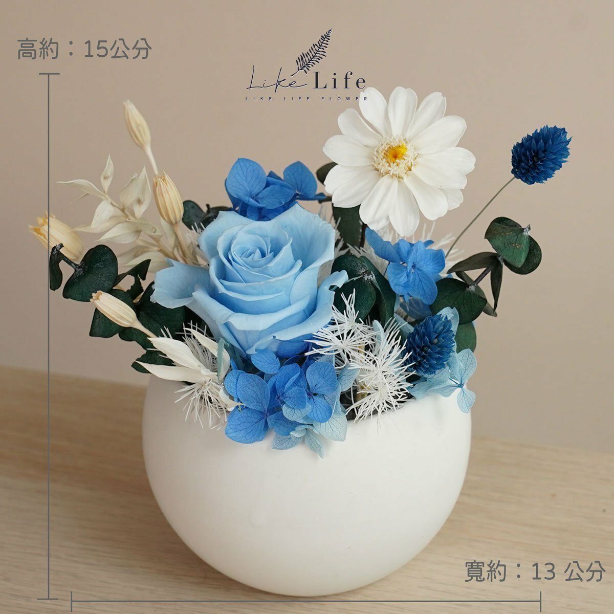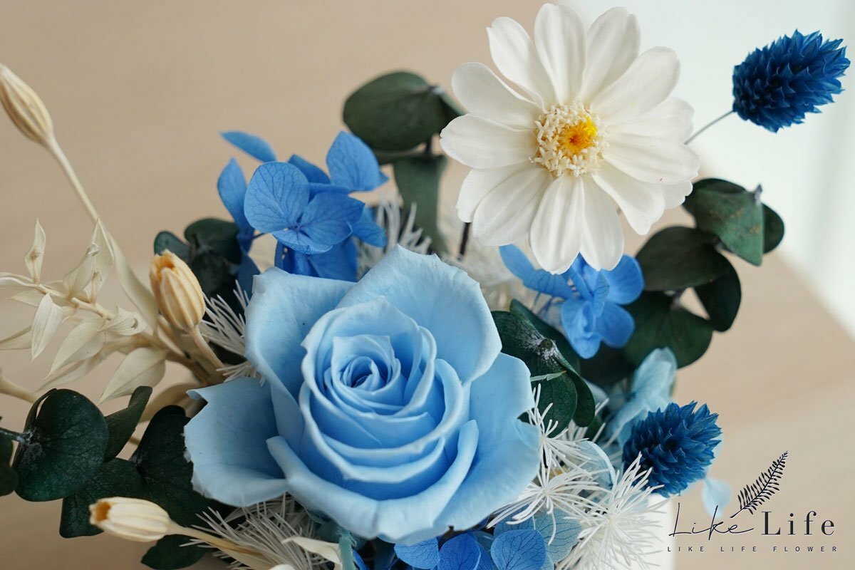 ※永生花是將玫瑰花,透過脫水與風乾的專利技術,保持著鮮花外觀和水份組織,不需要澆水和曬太陽,維持乾燥環境就可保存2~3年以上