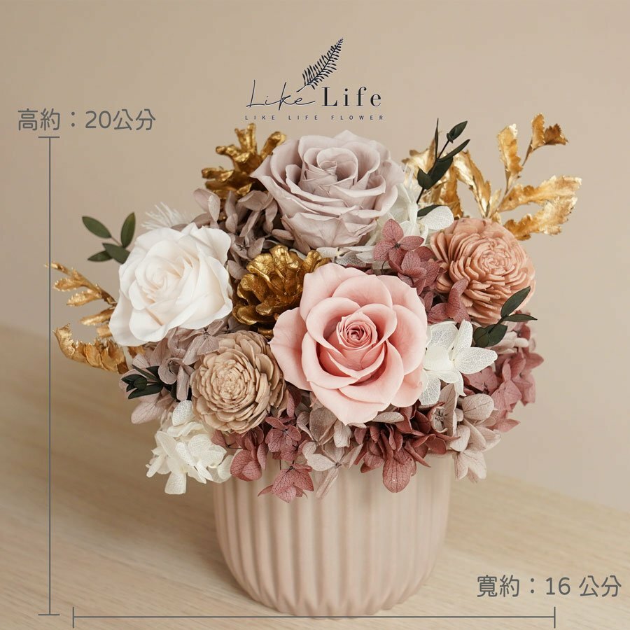 ※永生花是將玫瑰花,透過脫水與風乾的專利技術,保持著鮮花外觀和水份組織,不需要澆水和曬太陽,維持乾燥環境就可保存2~3年以上