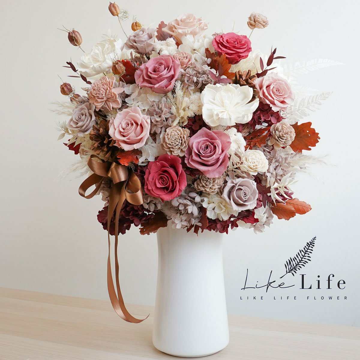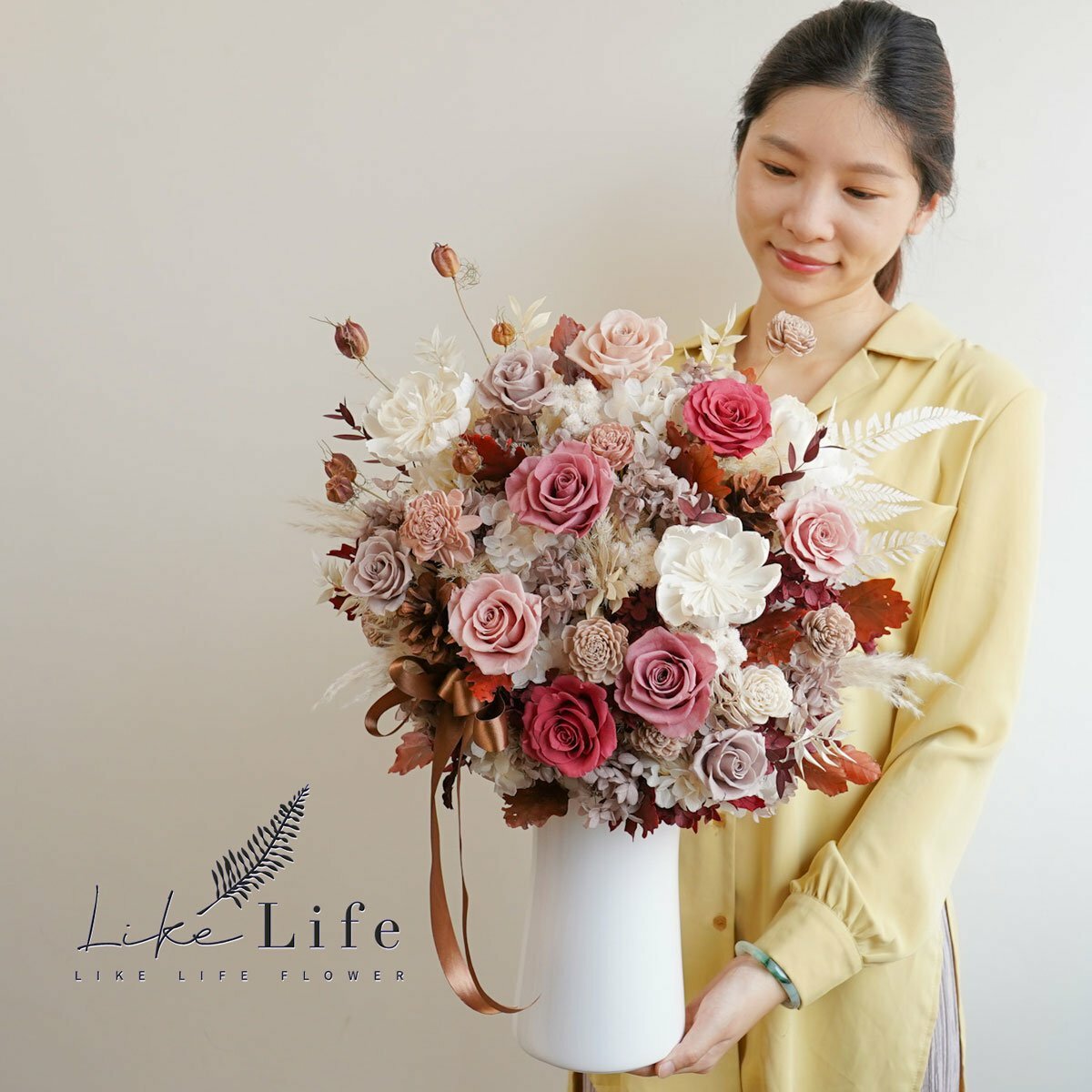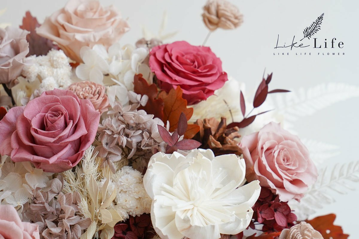 ※永生花是將玫瑰花,透過脫水與風乾的專利技術,保持著鮮花外觀和水份組織,不需要澆水和曬太陽,維持乾燥環境就可保存2~3年以上