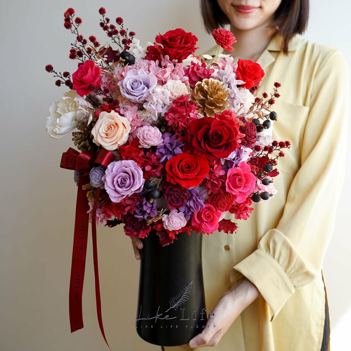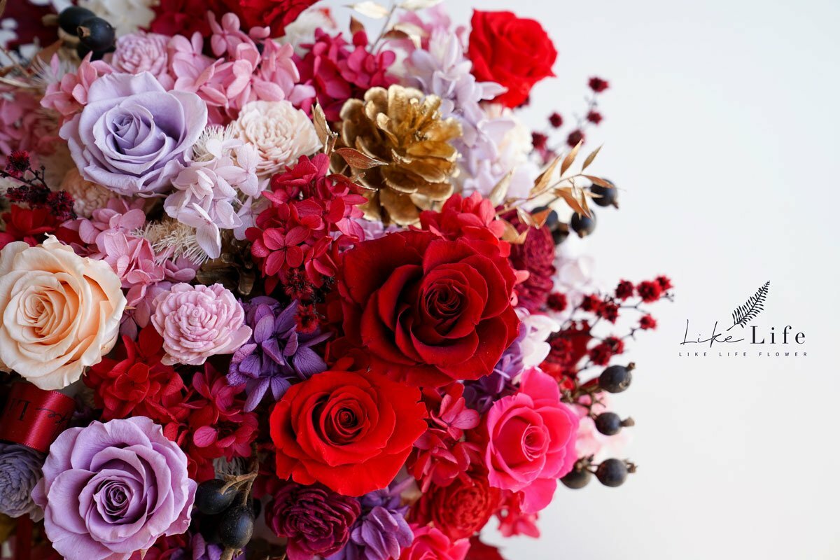 ※永生花是將玫瑰花,透過脫水與風乾的專利技術,保持著鮮花外觀和水份組織,不需要澆水和曬太陽,維持乾燥環境就可保存2~3年以上