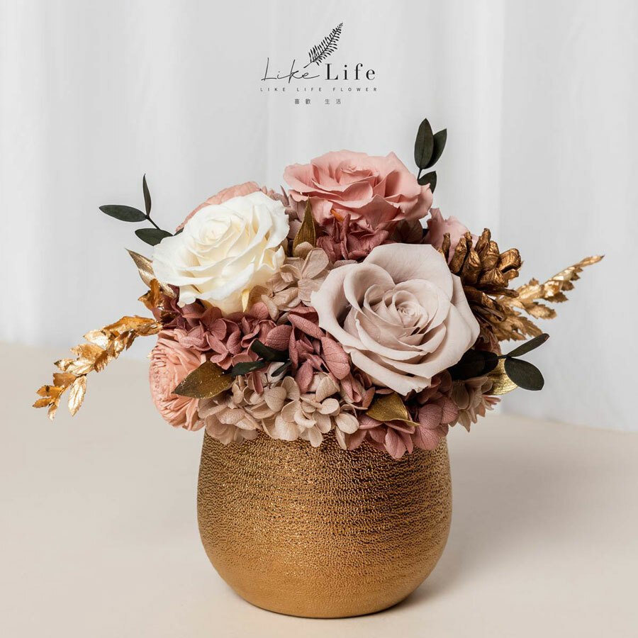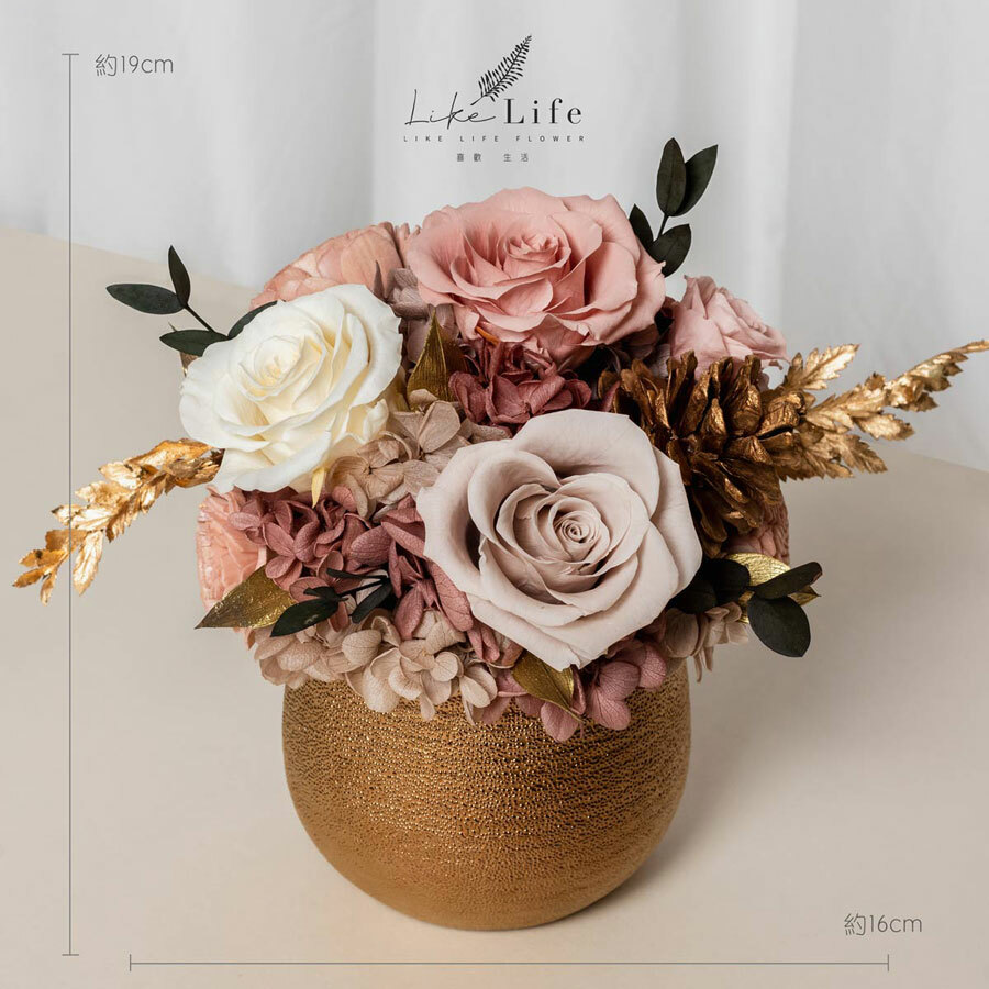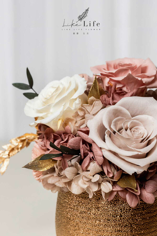 ※永生花是將玫瑰花,透過脫水與風乾的專利技術,保持著鮮花外觀和水份組織,不需要澆水和曬太陽,維持乾燥環境就可保存2~3年以上