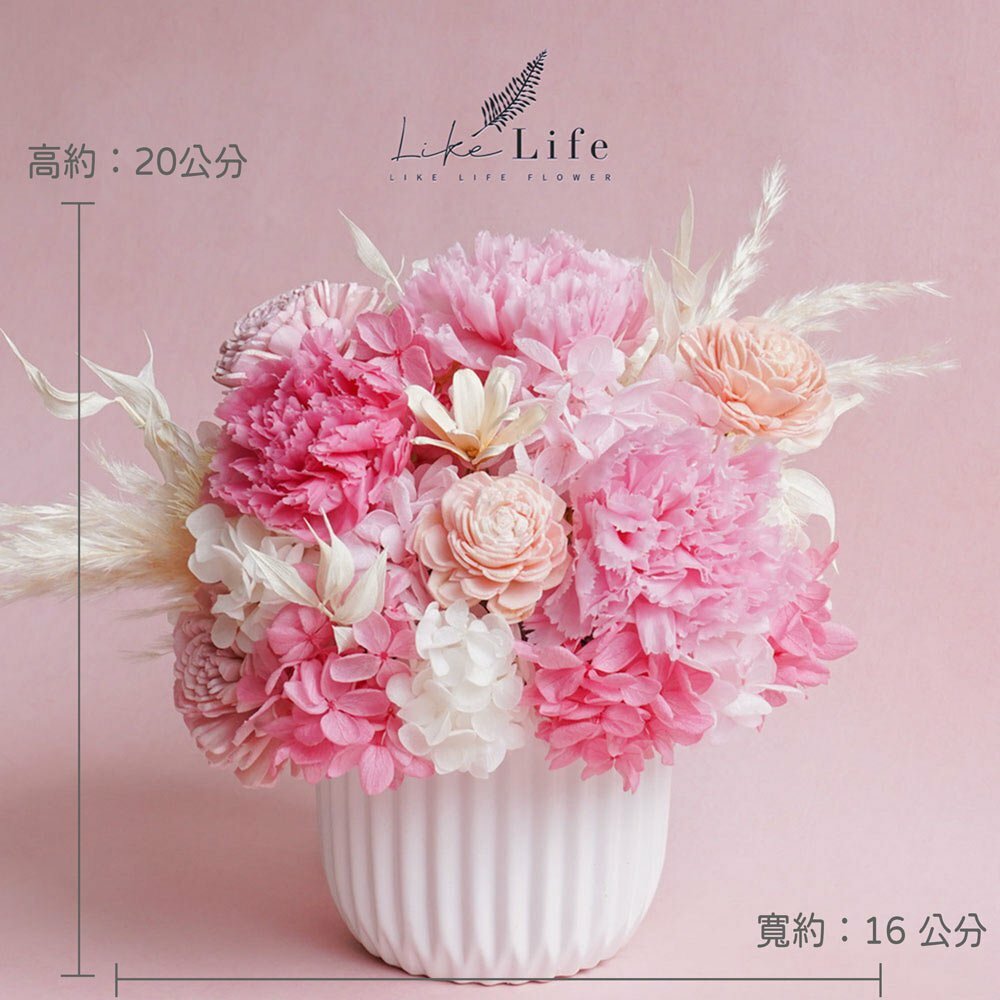 ※永生花是將玫瑰花,透過脫水與風乾的專利技術,保持著鮮花外觀和水份組織,不需要澆水和曬太陽,維持乾燥環境就可保存2~3年以上