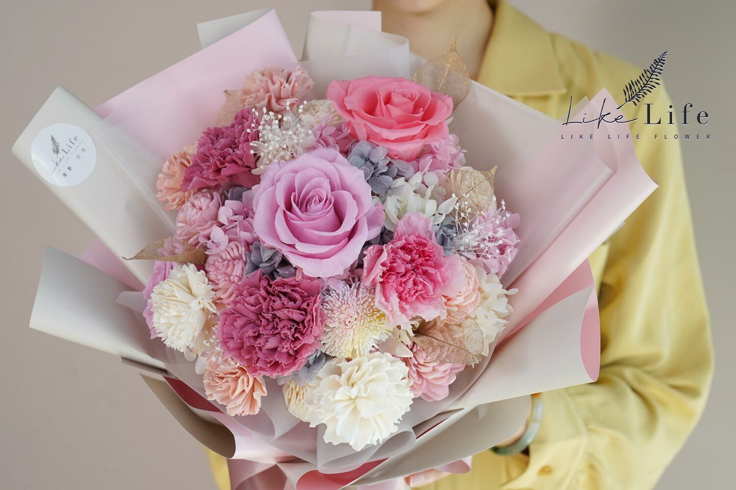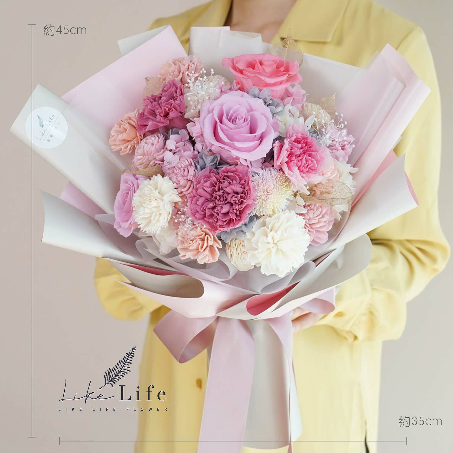 ※永生花是將玫瑰花,透過脫水與風乾的專利技術,保持著鮮花外觀和水份組織,不需要澆水和曬太陽,維持乾燥環境就可保存2~3年以上