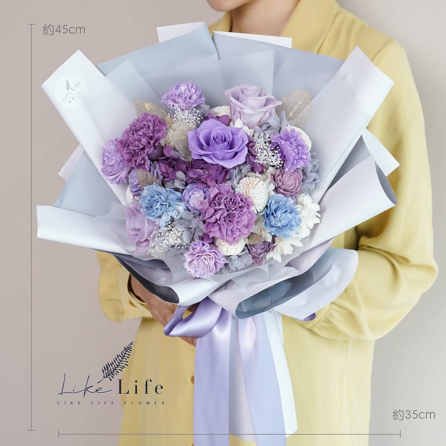 ※永生花是將玫瑰花,透過脫水與風乾的專利技術,保持著鮮花外觀和水份組織,不需要澆水和曬太陽,維持乾燥環境就可保存2~3年以上