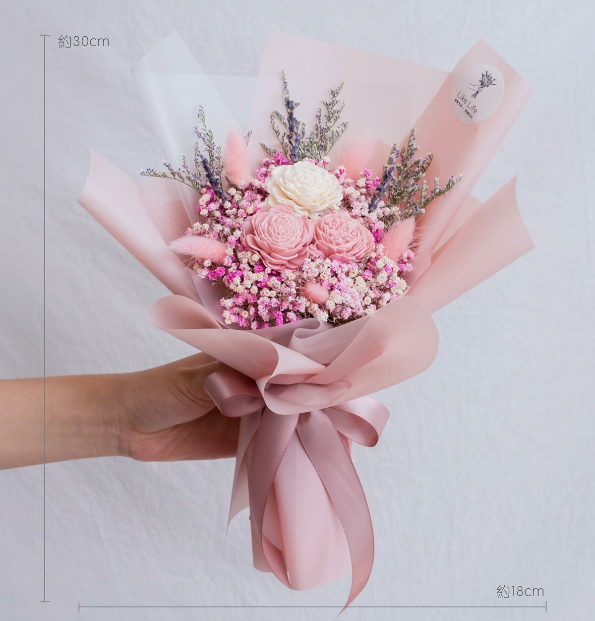 花束作品尺寸 高約 30公分 X 寬約 18 公分