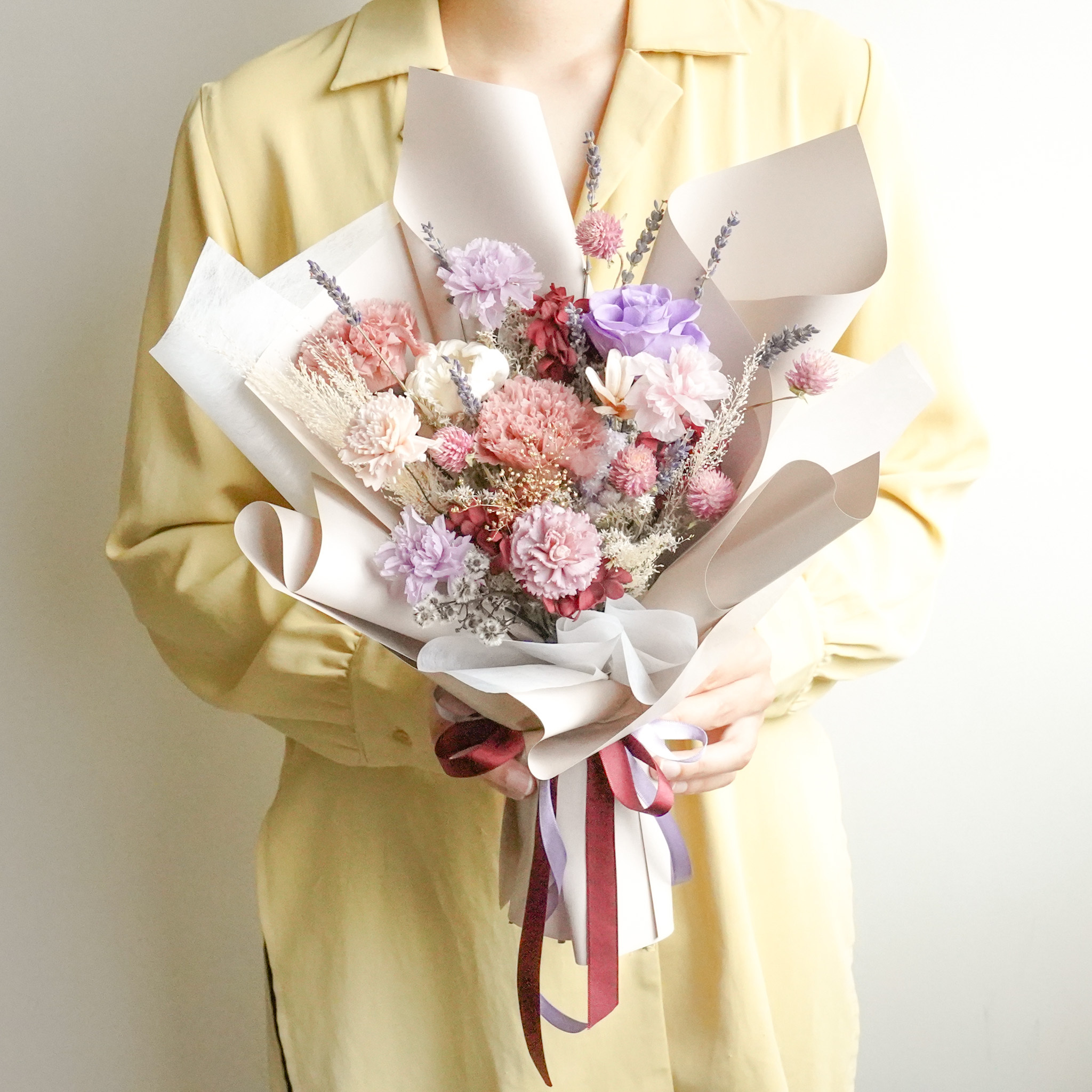 此作品以 藕粉紫色系的永生康乃馨、玫瑰為主